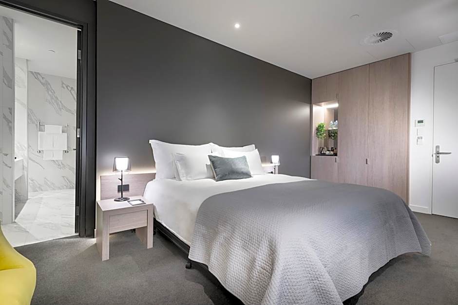 This contemporary suite features a balcony overlooking the internal courtyard. It has a large bathroom with a rain shower and a separate seating area with a Smart TV and free on-demand movies. A Sealy Posturpedic king bed, bespoke amenities, a Nespresso coffee machine, fluffy bathrobes and slippers and a work desk are included. There is a spacious wardrobe and dressing area and a mini fridge, tea/coffee making facilities, ironing facilities, premium linen, self-contained air-conditioning and heating, a personal safe and large wardrobes are provided.