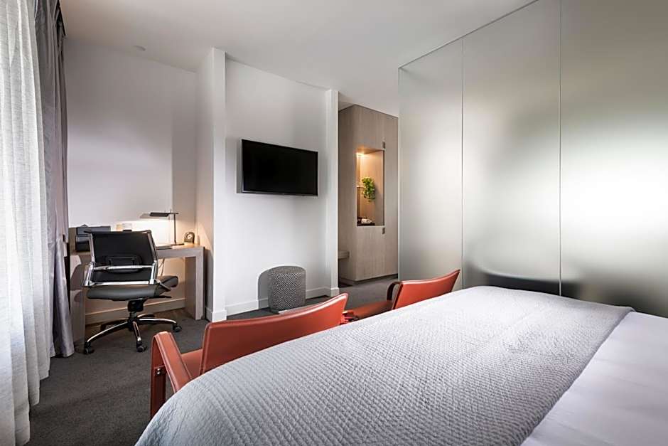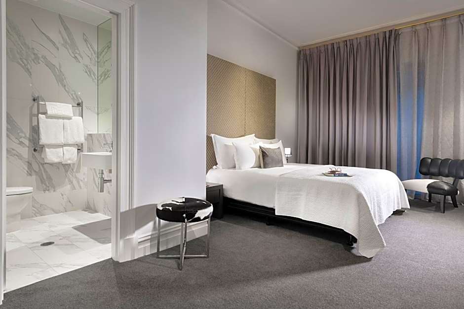 Overlooking the conservatory, capturing the essence of the original Melbourne Hotel's design, this spacious room features high ceilings, a work desk, Sealy Posturpedic king-sized bed, Molten Brown amenities, fluffy bathrobes and slippers. It also includes a Smart TV with free movies. A mini-bar, tea/coffee making facilities, ironing facilities, premium linen, Bluetooth door entry, self-contained air-conditioning and heating, a personal safe and large wardrobes are provided.
