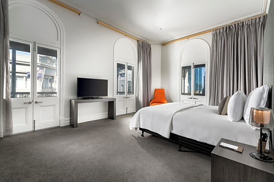 This unique room features heritage features, including high ceilings and sash-opening windows. There is a Sealy Posturpedic king-sized bed, bespoke amenities, fluffy bathrobes and slippers. It also includes street-facing views and a Smart TV with free movies on demand. There is a mini fridge, tea/coffee making facilities, ironing facilities, premium linen, self-contained air-conditioning and heating, a personal safe and large wardrobes.